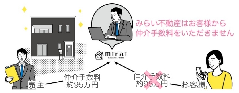 お客様からではなく、売主であるハウスメーカーなどから約90万円の仲介手数料をもらっているため、お客様から仲介手数料0円を実現しております。実は、当社だけでなくどの不動産会社も売主から仲介手数料をもらっています。