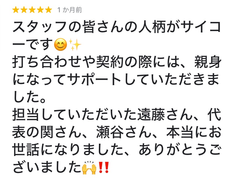 スタッフの皆さんの人柄がサイコーです!打ち合わせや契約の際には、親身になってサポートしていただきました。担当していただいた遠藤さん、代表の関さん、瀬谷さん、本当にお世話になりました、ありがとうございました!!