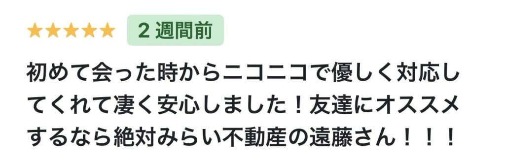 初めて会った時からニコニコで優しく対応してくれて凄く安心しました!友達にオススメするなら絶対みらい不動産の遠藤さん!!!