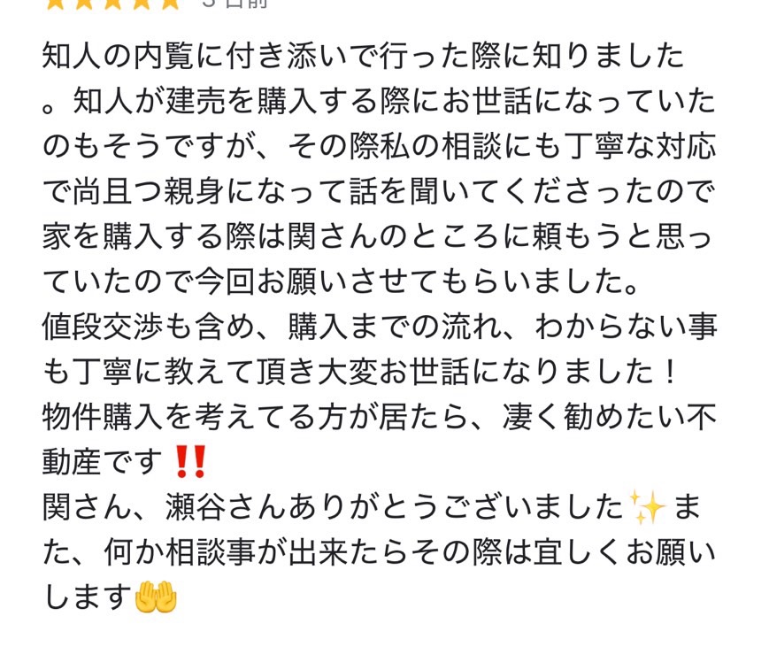 。知人が建売を購入する際にお世話になっていたのもそうですが、その際私の相談にも丁寧な対応で尚且つ親身になって話を聞いてくださったので、家を購入する際は関さんのところに頼もうと思っていたので今回お願いさせてもらいました。