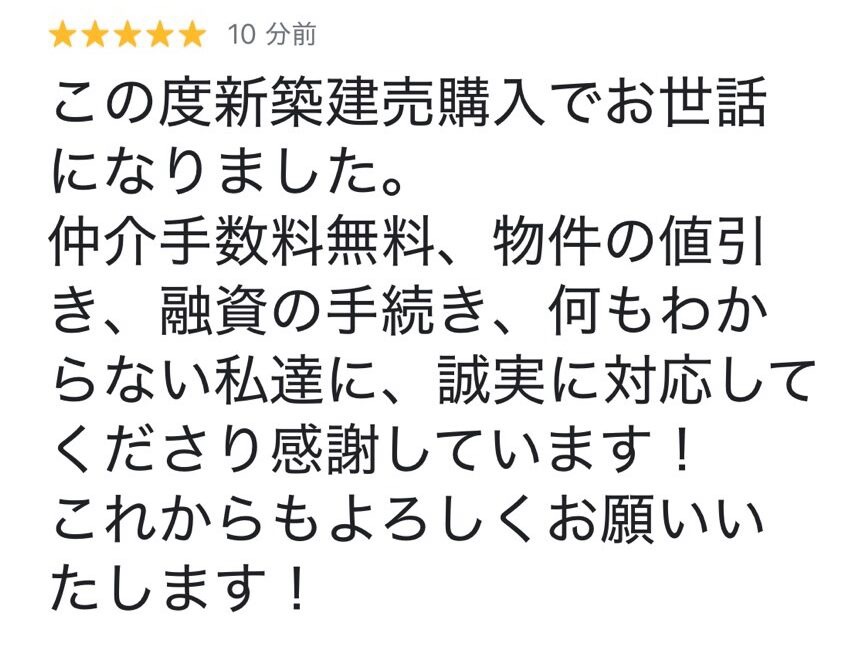 仲介手数料無料、物件の値引き、融資の手続き、何もわからない私達に、誠実に対応してくださり感謝しています!