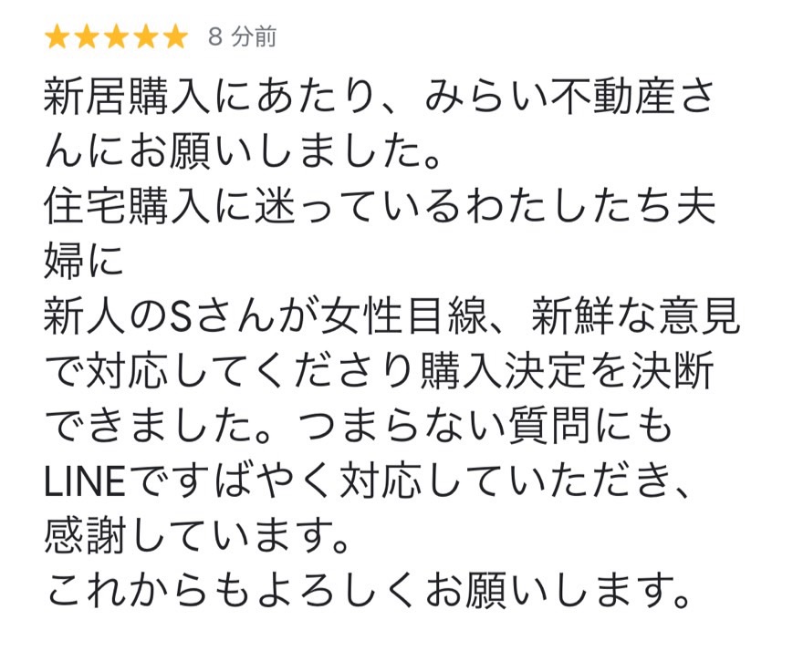 住宅購入に迷っているわたしたち夫婦に新人のSさんが女性目線、新鮮な意見で対応してくださり購入決定を決断できました。